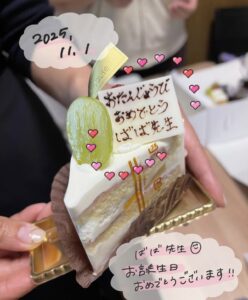 馬場先生のお誕生日でした🎂! 2026年3月2日 先日は矯正の歯科医師、馬場先生のお誕生日でした🎉お祝いと日頃の感謝を込めてスタッフみんなでケーキをいただきました🎂✨とても美味しかったです😆👏🏻先日もご紹介した北野駅近くのケーキ屋さんのものです!😸当院では月に数回、矯正の先生による診療を行っています🦷矯正をお考えの方はぜひご相談ください😊改めて馬場先生へ、いつもありがとうございます😸✨